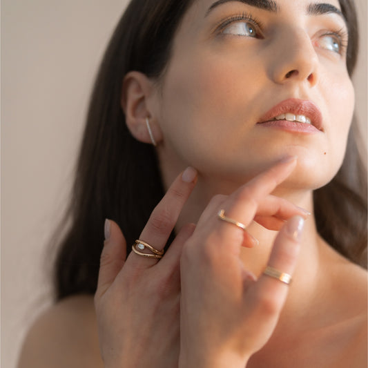 The Alongé collection embodies an elegant symbiosis of delicate craftsmanship and sustainable materials. The name "Alongé" stands for the artistic extension of the design, in which floating diamonds form the centerpiece and embody a unique lightness - a subtle but impressive expression of style and sophistication.